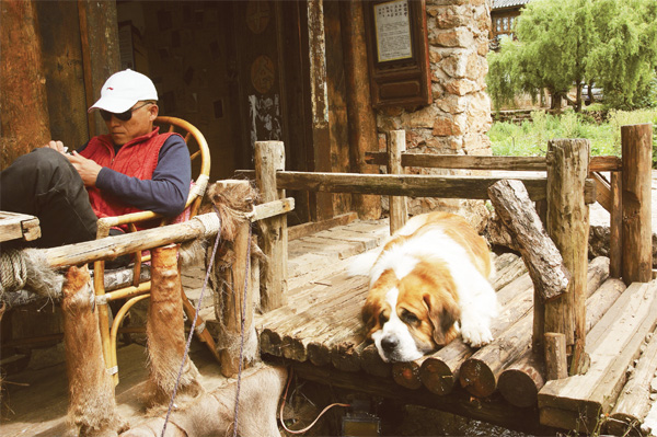水流之處,有垂柳,有店鋪,有住房,有酒吧,有食肆,有藝人在自彈自唱著,聽上去像唱片般的音質(zhì),非常柔和悅耳;有店主與狗在嬉戲或休憩,一切顯得那樣地閑適和散漫。陽光亮亮地照著,透過樹陰漏下或圓或角的光斑,照在想得到和想不到的地方,仿佛凝固的時光和歲月。樹下有躺椅、坐椅或石凳,你可以隨便坐下或躺下,讓時間在這里休止,讓煩憂在這里消散。如果要發(fā)呆,我想,束河古鎮(zhèn)或許是個很好的選擇。