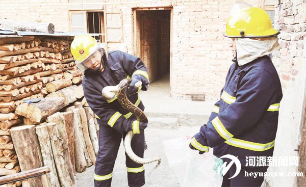近日,東源縣黃村鎮消防救援專職隊接到村民報警稱家中突然來了一條大蟒蛇。專職隊到達現場后,迅速穿戴好個人防護裝備,一名經驗豐富的救援人員利用捕蛇器瞄準時機將蛇捕獲,另一名救援人員輔助拿出事先準備好的編織袋,兩人配合將蛇制服,并放入編織袋中。現場處置完畢后,消防員將蟒蛇移交相關職能部門處置。