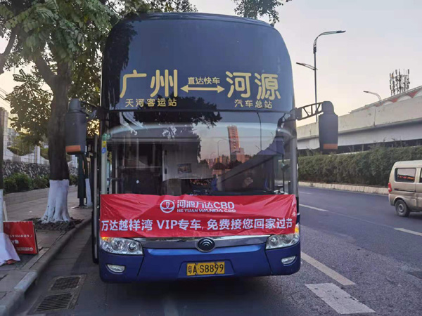 萬達越祥灣于2020年12月31日開啟免費VIP大巴專車,免費接在外務工、學習的河源老鄉回家。活動報名通道開放以來,廣受河源人民關注與贊賞,不少人介紹親友子女積極參加。返鄉大巴于12月31日晚于廣州天河客運站及深圳北站就近停車點發車。在旅程的全過程,萬達越祥灣實名登記每位河源老鄉的信息,為每位乘客提前購買保險,嚴格做好量體溫、戴口罩、保持座位間距等防疫工作。為避免節假日高速公路出現擁堵,導致乘客旅途過程中身體不適,萬達越祥灣提前準備了免費的礦泉水、點心,讓每位河源老鄉返鄉旅途更加舒適。
