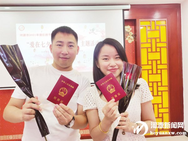 一對新人領取結婚證。