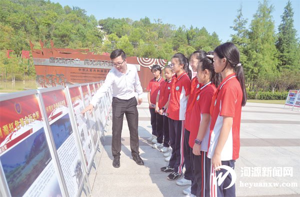 講解員正在為參觀圖片展的學生講解河源紅色革命歷史
