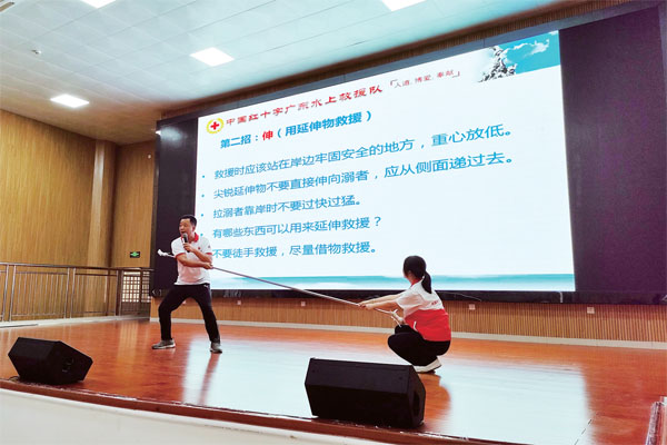 講座中,張培絢用生動的語言對如何辨識溺水風險隱患、如何避免溺水事故發生、如何科學有效救護等問題進行了講解,并通過與志愿者的互動演練,向現場觀眾演示如果遇到溺水事件,該如何利用身邊的繩子、水桶、竹竿等用具開展正確有效的施救。