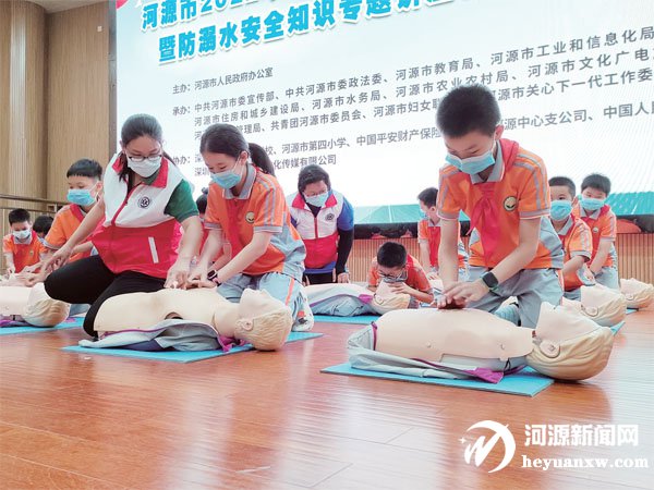 活動現場,河源市120指揮中心的醫護人員還就如何對被救上岸的溺水者進行搶救等問題進行了解答,并邀請現場學生進行心肺復蘇術實操演練,教會學生遇到心搏驟停溺水者時如何為其搶救贏得寶貴時間。