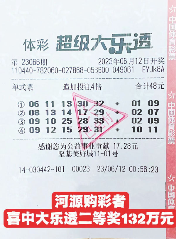 本報訊 記者 吳心怡 通訊員 李超嵐 6月12日,體彩超級大樂透第23066期前區(qū)開出號碼“06、11、13、30、32”,后區(qū)開出號碼“01、03”。位于我市堅基美好城11-01號的4414030442體彩實體店傳來喜訊,一幸運購彩者喜中第23066期體彩超級大樂透二等獎4注,狂攬132萬元獎金,為我市稅收貢獻26.4萬元。