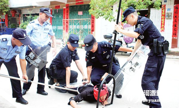 培訓中,巡特警大隊隊員重點圍繞如何提升應對突發事件處置能力,深入淺出地講述了反恐防暴相關安全知識,對防護盾牌、橡膠警棍、辣椒水、安全鋼叉等安保器械的正確使用方法進行了詳細講解和現場示范教學,讓學校保安人員和老師提升了應對緊急校園暴力事件的自救能力。隨后,巡特警大隊隊員與學校保安人員還開展了實戰演練。