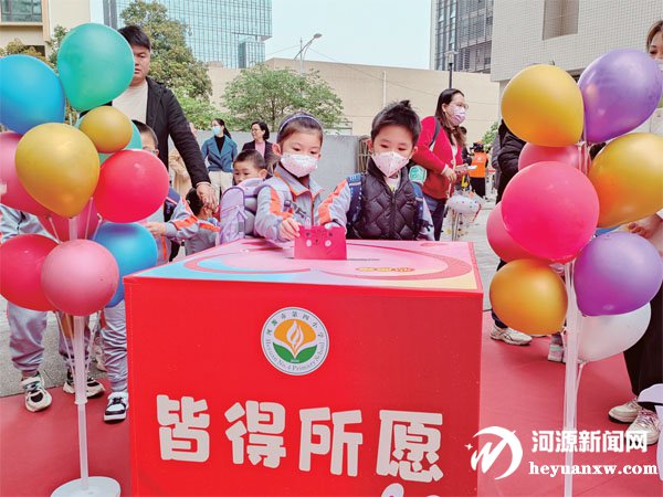 河源市第四小學學生將“心愿卡”投入“皆得所愿”心愿箱。