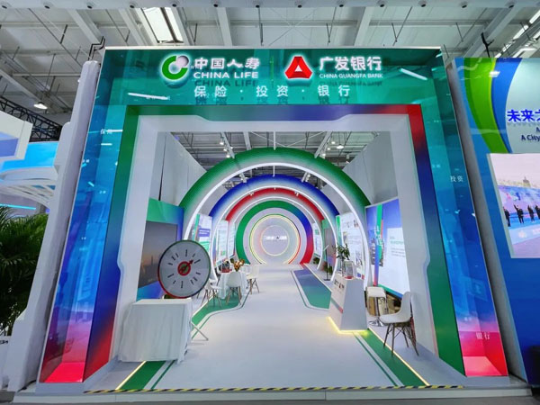 在服貿會的金融展區9號廳,中國人壽、廣發銀行的聯合展位以三色環的獨特形象吸引了眾多來訪者的圍觀,方形的巨大入口上方標有“中國人壽-廣發銀行”聯合LOGO,彰顯出一家世界500強金融央企以打造綜合金融為核心競爭力的服務形象。