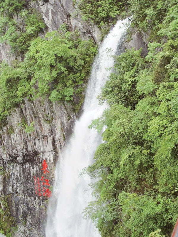 在香港同胞捐建的思源亭休息片刻,又起程向瀑布方向出發。沿著陡峭的臺階下到谷底,仰望瀑布飛瀉,“東江源”幾個大字顯得蒼勁有力,瀑布的水珠常常會從高空打到游客的臉上,讓人浮想聯翩;飛瀉的瀑布形成的水霧飄入谷底,讓人情不自禁想起了李白的“飛流直下三千尺,疑是銀河落九天”。