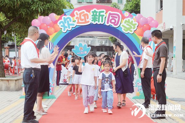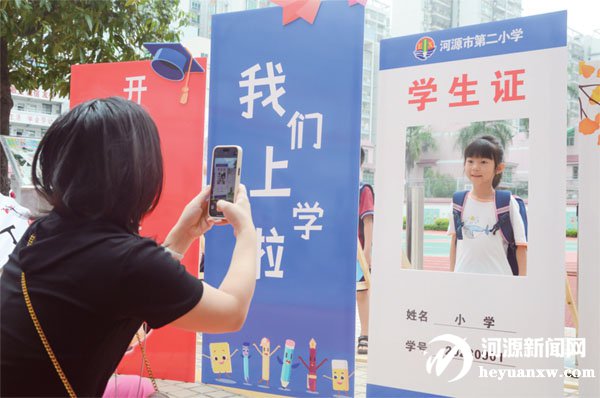河源市第四小學舉行了以“筑夢新程,未來可期”為主題的新生入學儀式,以豐富多彩的形式迎接新生們的到來。在校門口,老師們為步入校門的一年級新生進行朱砂點“智”,希望孩子們眼明心明,好讀書,讀好書,還有許多家長與孩子在門口設立的趣味立牌合影,用照片記錄下孩子人生中的重要時刻。接著,學生與家長穿過“智慧門”,登上“步步高”階梯,帶著學校與老師們對新生的美好祝愿,來到各自的班級。老師為一年級學生開展“開筆禮”,教導他們一撇一捺鄭重寫下“人”字,希望他們在人生的啟蒙階段學會做人,成長為德才兼備的新時代少年。一年級新生家長葉先生與妻子一同帶著孩子入學,看著女兒步入小學,心里既開心又感慨,“希望孩子能在學校照顧好自己,認真讀書,天天開心就夠了。”