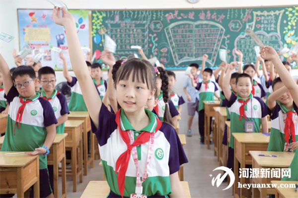源城區雅居樂小學的校領導和老師們早早就在校門口等待學生們返校,學校還在校道上設置了色彩豐富的拍照墻,引得不少新生家長與孩子拍下新階段的第一張照片。在開學典禮上,雅居樂小學進行了探究實施五育并舉評價改革后的第一場“五好學生”頒獎儀式,學生們興致高昂。