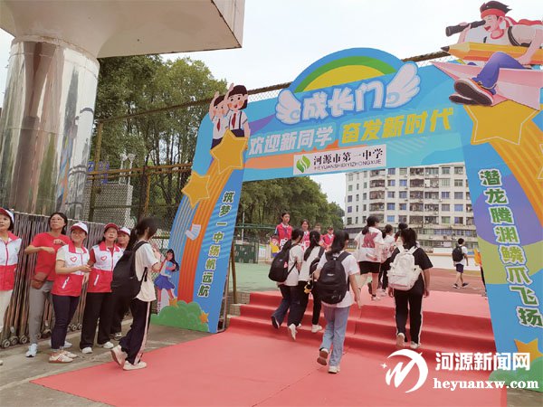 河源市第一中學學生穿過“成長門”,開啟新學期。