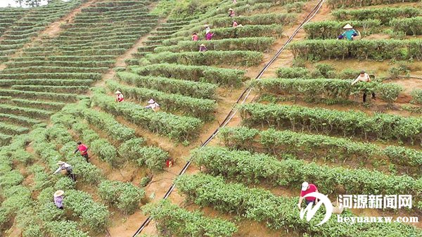 客家紅生態茶園中,農戶們在采摘茶葉。