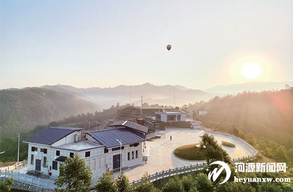 東源縣生態氣象綜合監測基地在晨光中升放北斗探空氣球。