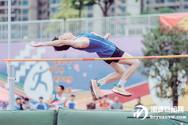 河源市首屆中小學生田徑錦標賽暨廣東省第十四屆中學生運動會田徑項目選拔賽跳高項目上,運動員奮力一躍。