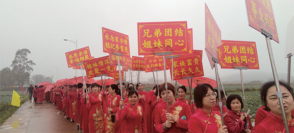 活動當(dāng)天,歡快喜慶的音樂在村里回蕩,伴隨著鞭炮聲和鑼鼓聲,410多名外嫁女身著鮮艷旗袍,或手撐油紙傘、高舉標語,或肩挑禮擔(dān),她們帶著幸福的笑容,在醒獅隊的引領(lǐng)下回到熟悉的家鄉(xiāng)。沿途鄉(xiāng)親們夾道歡迎,大家紛紛拿出手機記錄下這溫馨和熱鬧的一幕,共同感受濃厚的團圓氛圍。
