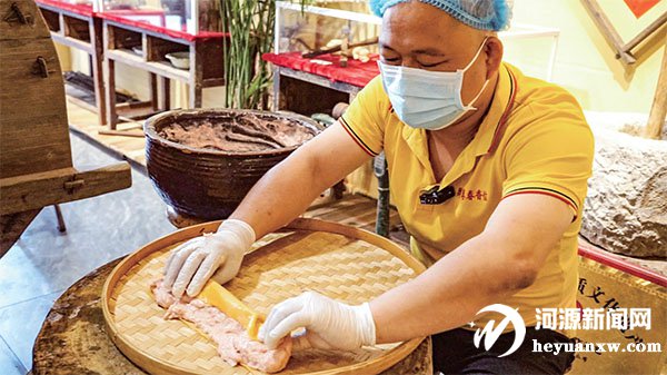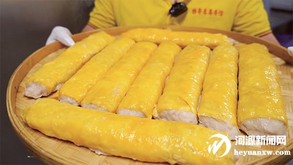 在龍川客家人的味蕾記憶中,卷春最能代表家鄉(xiāng)的味道。作為龍川縣非物質(zhì)文化遺產(chǎn),雅寄卷春制作技藝歷史悠久,起源于清末。卷春采用新鮮豬后腿肉,歷經(jīng)“剔除肥肉、捶打、攪拌肉餡、裹春皮”等工序后蒸煮而成,其色澤金黃、清甜爽口,富有彈性,切開呈圓形,寓意“春春車車,團團圓圓”。