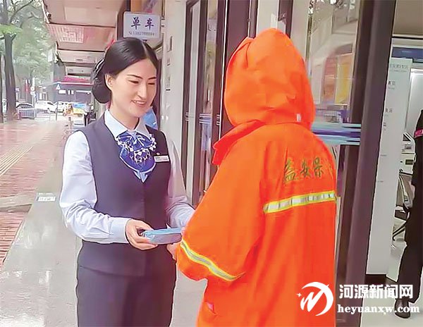 近期,我市降雨天氣頻繁,建行河源市分行工作人員在“勞動者港灣”配足雨具,派送給忘帶雨具的外賣員、快遞小哥、安保人員、保潔阿姨等人群。此外,該行還將“勞動者港灣”服務延伸至戶外,安排人員走上周邊街道,及時為環衛工人們送上愛心雨衣,“衣”路相伴,護其安全,同時還安排人員走進工廠、走進企業,為工廠和企業員工提供上門金融服務,送上便攜杯、雨傘、靠枕、鼠標墊等便民物品。
