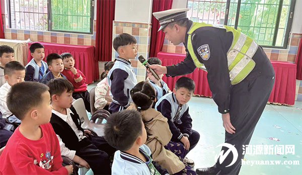 “法治進(jìn)校園”宣傳活動(dòng)中,民警與孩子在互動(dòng)。