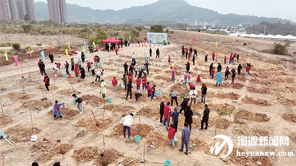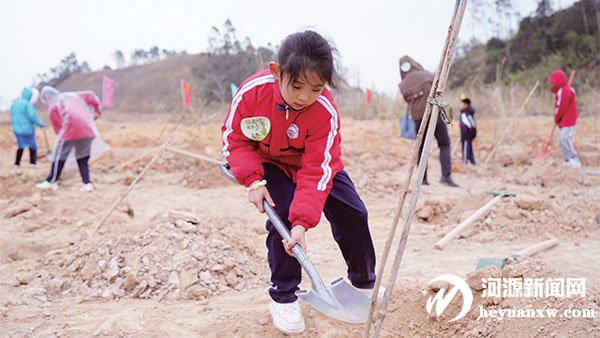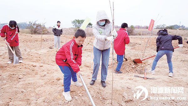 在工作人員的引導下,家長和孩子分工明確、配合默契,揮鍬填土、扶植苗木、提水灌溉、踩土固苗,各個工序有條不紊。大家合力栽下一棵棵樹苗,現場呈現出一派熱火朝天的勞動景象。經過家長和孩子們的辛勤勞作,一棵棵新栽的樹苗迎風挺立,傳遞著春天的生機與活力,為河源增添了濃濃的春色。