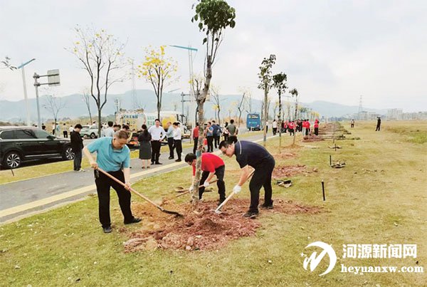 植樹現場,大家分工協作,揮鍬鏟土、扶苗定根、培土圍堰、提水澆灌,一絲不茍地完成每道工序。經過一上午的辛勤勞動,共種植了約220棵秋楓,新栽的樹苗錯落有致、迎風挺立,為河源增添了一抹盎然生機,勾勒出“黨建紅”與“生態綠”交相輝映的春日畫卷。