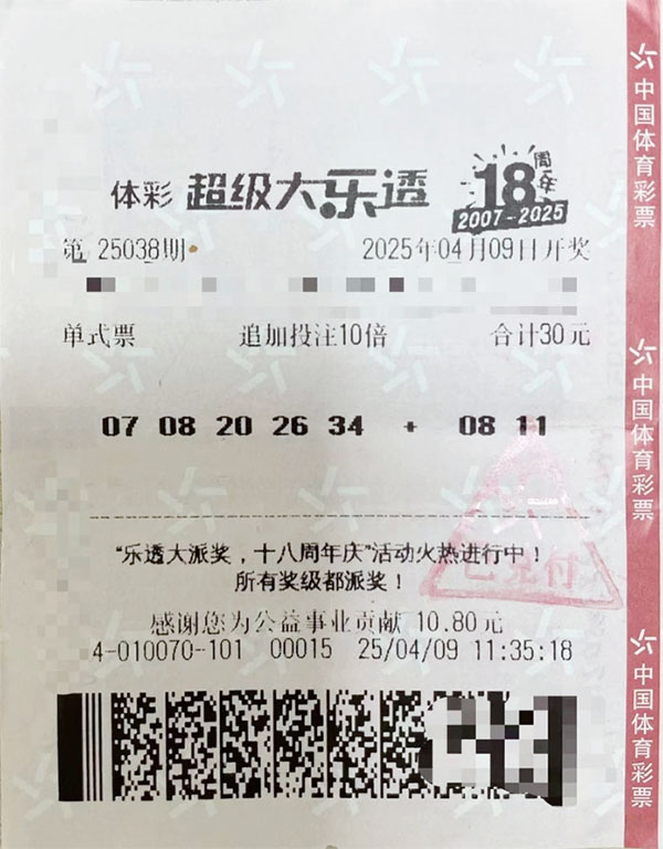 據了解,中獎彩票出自河源市龍川縣老隆鎮新城區登峰路78號4414010070體彩實體店,為一張單式追加10倍投注的彩票,投注金額30元。當期開獎號碼前區為“07、08、20、26、34”,后區為“08、09”。中獎者以機選方式完成投注,前區號碼“07、08、20、26、34”與開獎號碼完全匹配,后區號碼“08、11”中得“08”,最終成功擊中二等獎。