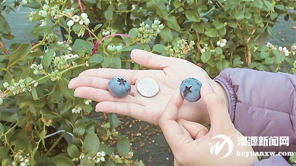 近日,東源縣上莞鎮冼川村的藍莓進入豐產期,一元硬幣般大小的藍莓汁甜味美,備受市場及廣大市民的青睞。走進冼川村二龍藍莓基地,藍色大棚里成片的藍莓樹上,一顆顆飽滿圓潤的“藍色寶石”新鮮誘人。工人們在藍莓地里忙碌穿梭,精心挑選采摘。與普通藍莓不同,冼川村的藍莓個頭更大,平均直徑達到18毫米以上,最大的甚至超過25毫米,堪比一元硬幣大小。