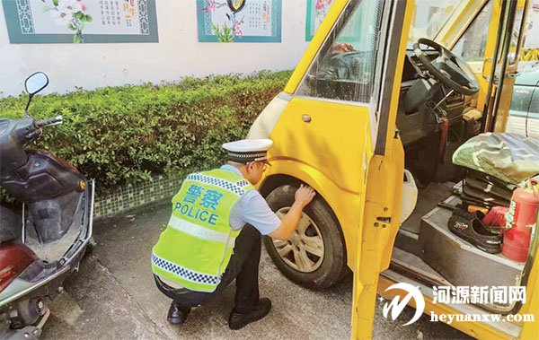 連平縣公安局交管大隊開展校車安全專項檢查行動,通過進校檢查等方式,對全市校車及校車駕駛員進行全面檢查。民警認真核對了校車駕駛員的資質,確保人、車、證相符,從源頭保障校車運行安全。在車輛安全性能方面,民警圍繞剎車系統、輪胎磨損情況、燈光照明設備等關鍵部位進行仔細檢查。民警還對車內設施也逐一核驗,包括安全帶、滅火器、安全錘、急救藥箱等設備能否正常使用和配備齊全,確保車輛在行駛過程中性能穩定可靠。