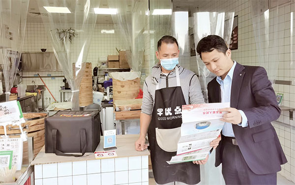 銀行員工為商鋪老板普及貨幣反假知識(shí)。