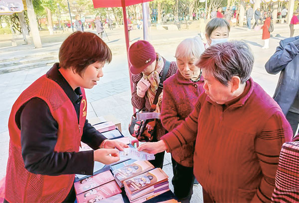 工作人員向市民宣傳養(yǎng)老反詐知識(shí)。