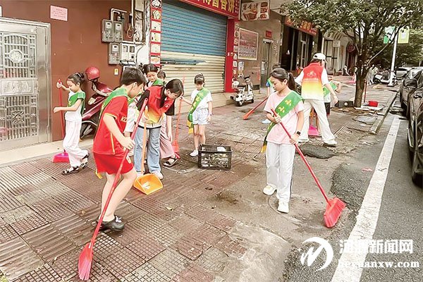 孩子們在認(rèn)真清掃路面、撿拾垃圾。