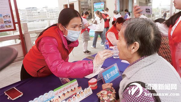 志愿者為社區(qū)居民免費(fèi)檢查口腔。