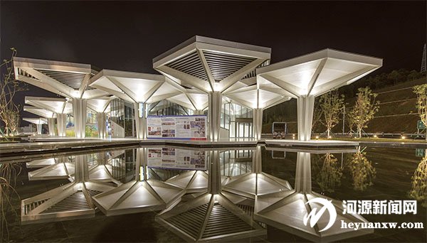 去年,龍尋高速建成通車,吉祥服務區同日開門迎客。吉祥服務區主服務樓的設計理念源自河源市的市花三角梅。設計團隊提取三角梅的基本幾何原型“三角形”,并融入六邊形傘狀造型。服務區建筑共有106個傘單元,均以清水混凝土為主要建筑材料,“一把傘”由1根異形立柱、6根封邊梁、6根懸挑梁、18塊UHPC板,共31塊預制件拼裝而成,外表通過澆筑清水混凝土一次成型,整體裝配率93%。
