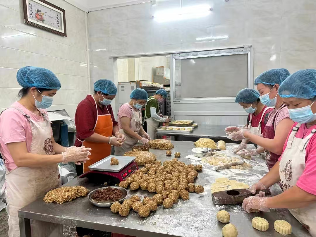 為應對激增的中秋訂單,賴天生帶領團隊加緊趕制月餅——包餡、壓模、烘烤,車間內香氣四溢,每一道工序都有條不紊地進行。金裝五仁叉燒皇、雙黃白蓮蓉等經典口味的月餅頗受歡迎。一位特地從深圳回來買月餅的鄭先生說:“非遺月餅又香又脆,味道很好,打算買十幾盒,送給親戚朋友。”
