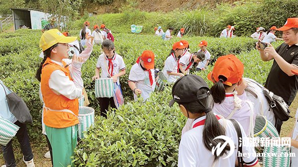 同學(xué)們在黃花莊園茶文化研學(xué)基地采摘茶葉。