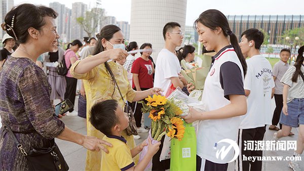 走出考場(chǎng),考生收到家人送上的花束與關(guān)愛(ài)。本報(bào)記者 劉奇峰 曹志成 李馨 謝夢(mèng)君 梁小鴻 實(shí)習(xí)生 鐘昊哲 攝